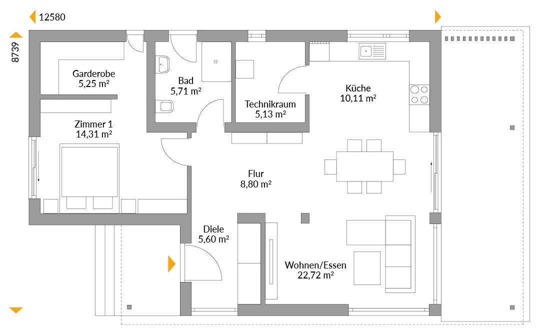 Next 80 FT verlängert Ihre Outdoor-Saison: Eine ganze Hausseite ist großzügig überdacht und schützt Ihren Terrassenplatz nicht nur vor zu viel Sonne, sondern auch vor kurzen Regenschauern. Sitzpolster können hier übernachten und Terrassenmöbel überwintern. Und falls Sie Ihr Flachdach begrünen möchten, ist das ein kleiner, aber schöner Beitrag zum Klimaschutz.