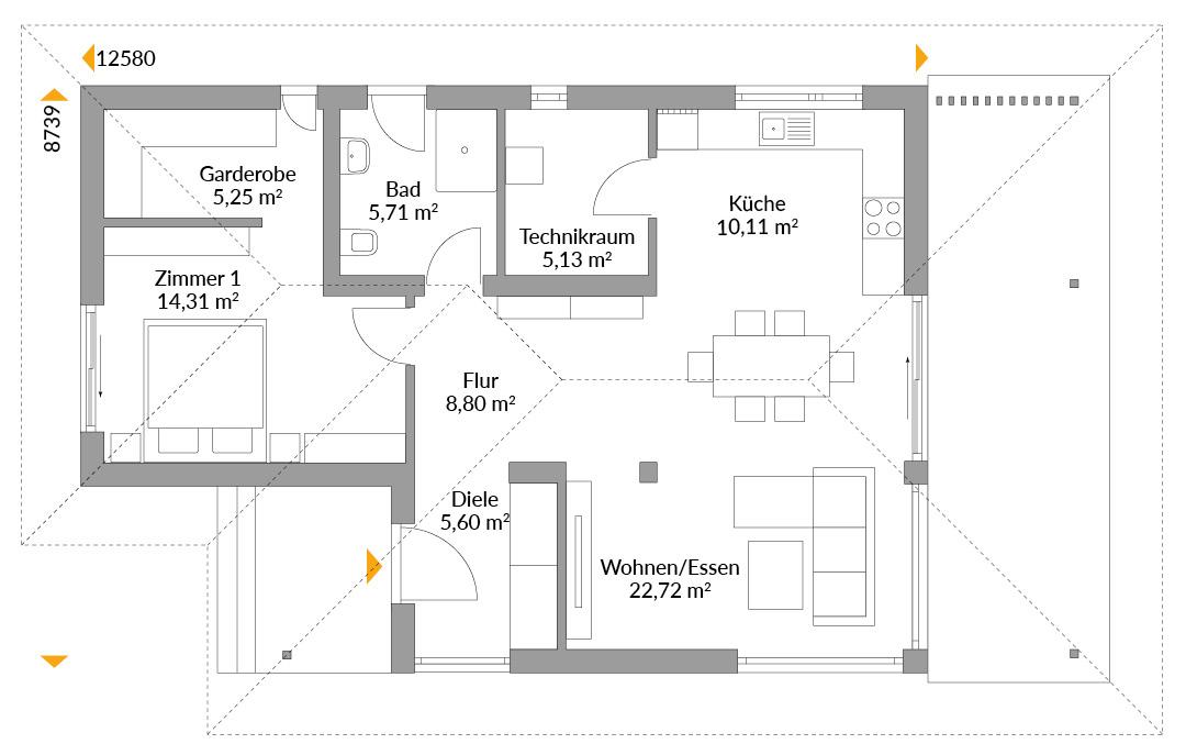 Die großzügige Dachlandschaft behütet Ihren hochmodernen Lebensraum und bietet Ihnen neben Stauraum im Dachboden eine schützende Terrassenüberdachung samt schattenspendender und windbrechender Lamellen-Seitenwand. So können Sie Ihren Speisesalon während vieler Wochen des Jahres nach draußen verlegen und zum guten Essen den Duft von Blumen genießen.